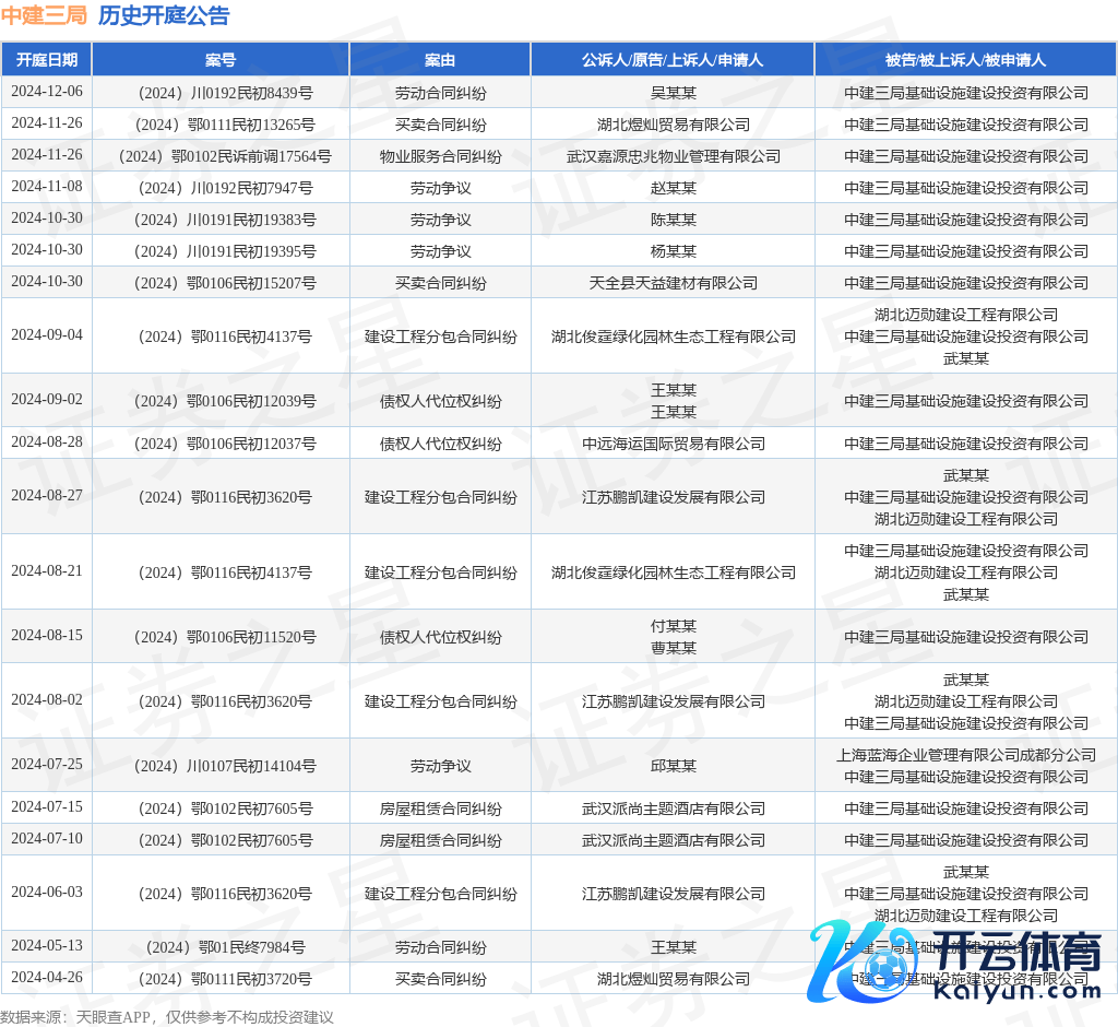 本站音书开云体育,把柄天眼查APP清醒,近日公布了一则中建三局基础时势诞生投资有限公司动作被告/被上诉东说念主的开庭公告,堤防推行如下: