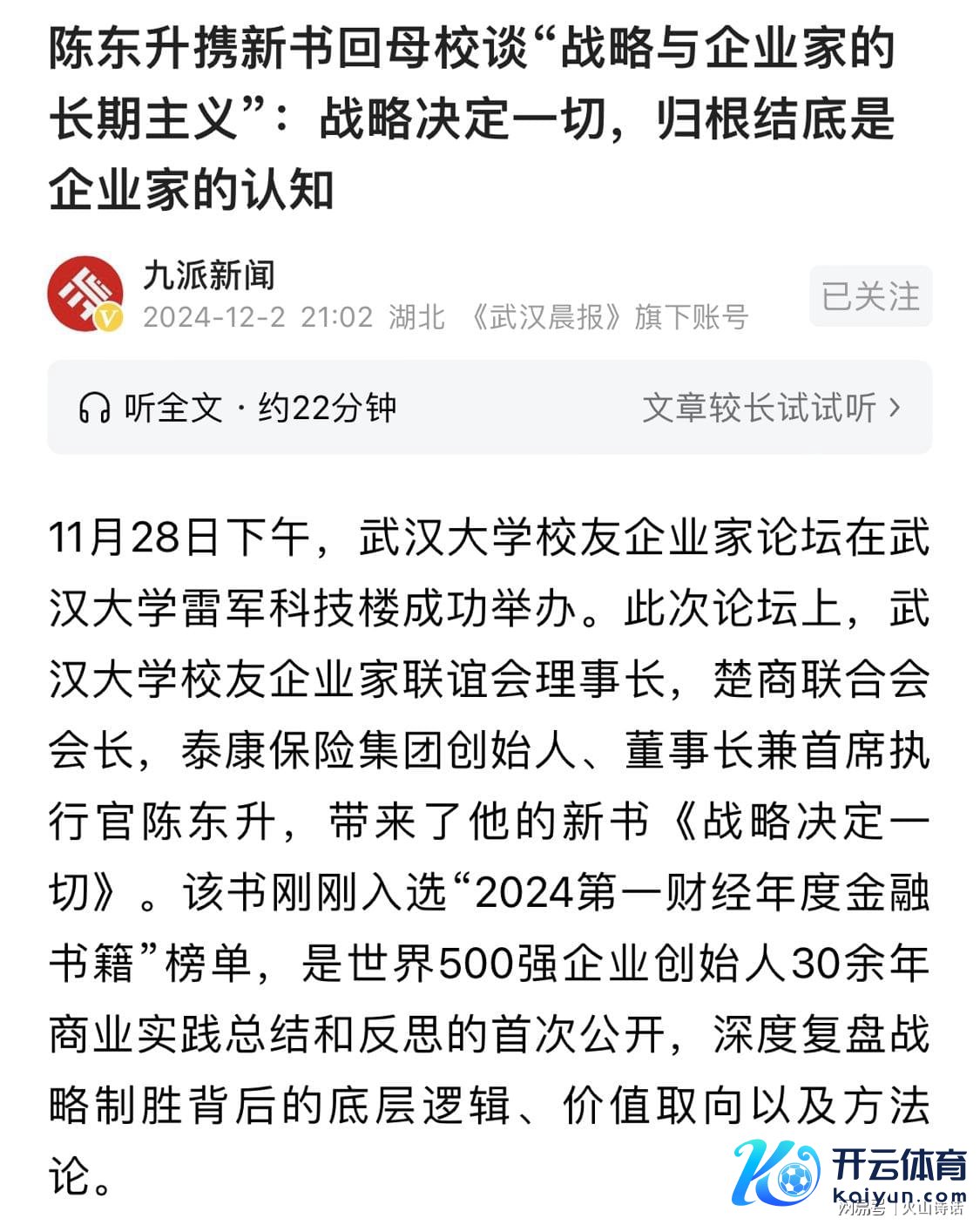 在本年11月28日下昼,武汉大学学友企业家论坛在武汉大学雷军科技楼得手举办。这次论坛上,武汉大学学友企业家联谊会理事长,楚商聚拢会会长,泰康保障集团首创东说念主、董事长兼首席推行官陈东升,带来了他的新书《政策决定一切》。