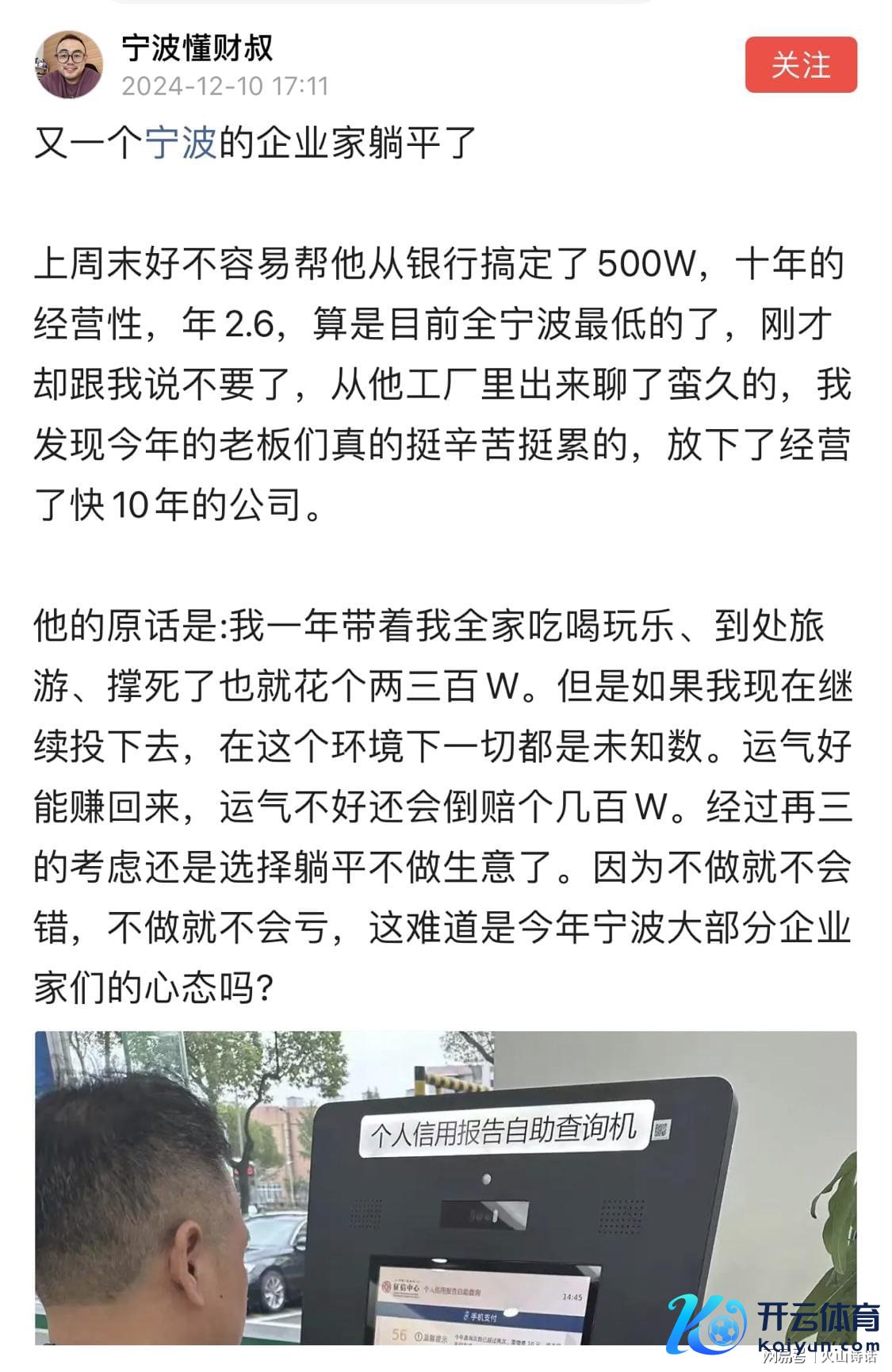 近日有网友发帖称,又一个宁波的企业家躺平了!上周末好拦阻易帮他从银行措置了500W,十年的指标性,年2.6,算是咫尺全宁波最低的了,刚才却跟我说不要了开yun体育网,从他工场里出来聊了蛮久的,我发现本年的雇主们确切挺辛勤挺累的,放下了指标了快10年的公司。