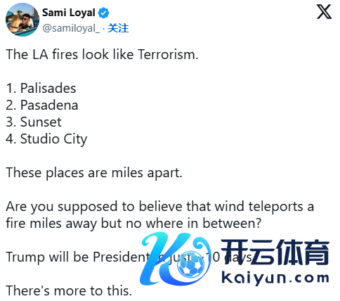 “洛杉矶的失火看起来像是恐怖目的活动……这些场合相距数英里。你能深信风会将火势传播到数英里以外,但中间地带却毫发无损吗?”